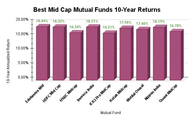 For the last 10 years, all 10 mid cap funds have given returns ranging from 16%-18%, which takes the 10-year returns average to 17.5%, outperforming fixed deposits and most large cap funds. For this period, Edelweiss Mid Cap Fund tops at 18.44% returns, followed by HDFC, Invesco and Nippon India Funds that are all above 18%. Refer to the graph below that compares the best mid cap mutual funds last 10 years return: