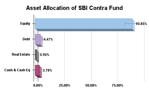 More than 90% of the fund's assets are allocated to equity funds. Hence, it was earlier said that the SBI Contra Fund largely falls under the equity fund category. In addition, the reason is that equity funds hold the potential to provide greater returns. Moreover, the fund has also allocated assets in debt (4.47%), cash and its equivalents (3.78%) and real estate (0.90%).