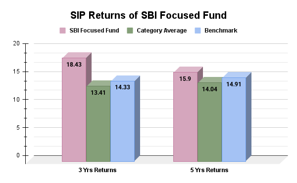 The SBI Focused Fund delivers impressive returns for investors using a SIP. It generated 18.43% growth over three years and 15.9% over five years. These figures exceed the category averages of 13.41% and 14.04% with a broad difference, as well as the benchmark at 14.33% and 14.91%. Look at the graph below: